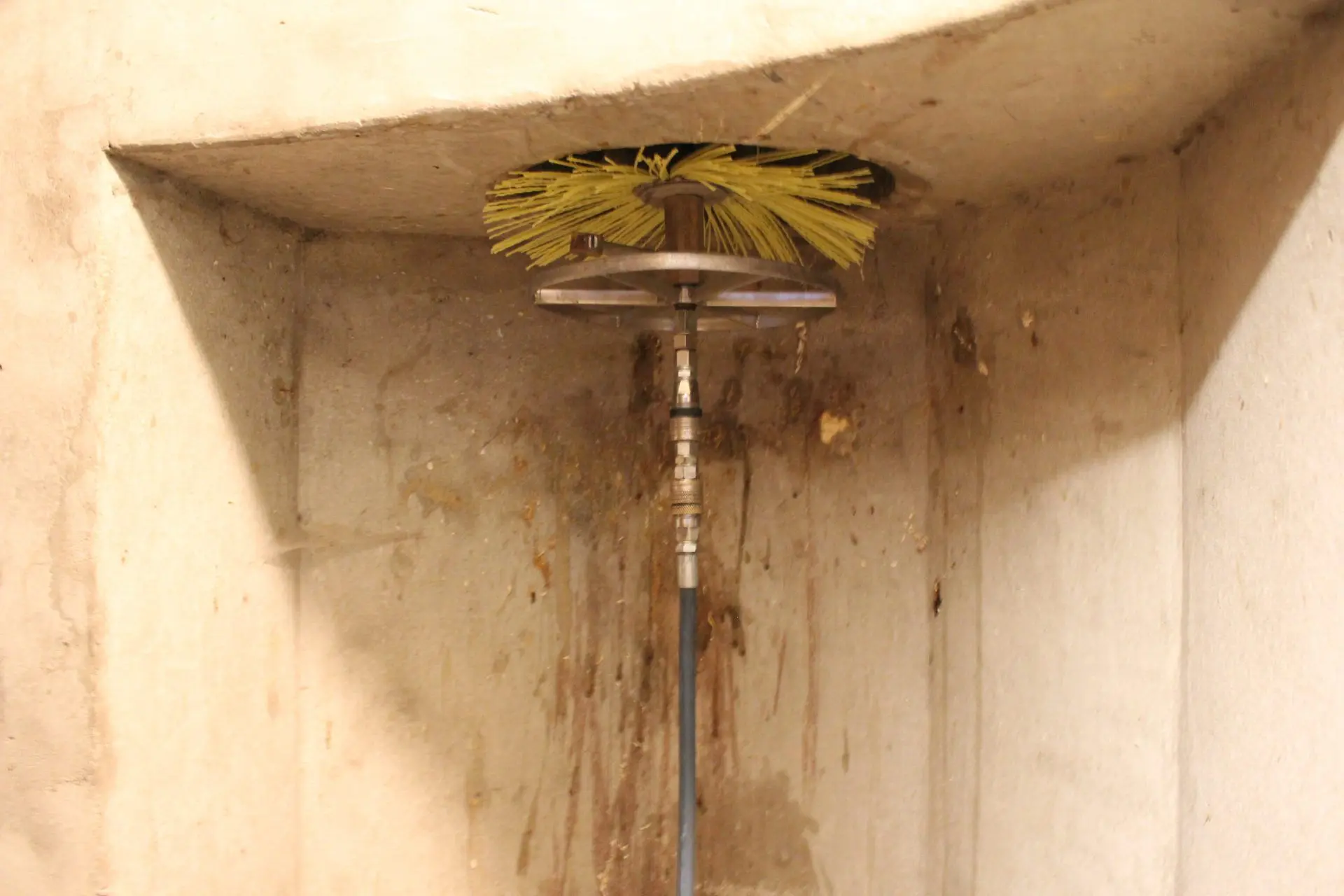 Sopnedkast tvättar vi med ett roterande spolmunstycke som viras upp och ner i nedkastet tills dess att det blivit rent. Munstycket kombinerar varmvatten, högtryck och en roterande borste för att så effektivt som möjligt avlägsna smuts och odörer.